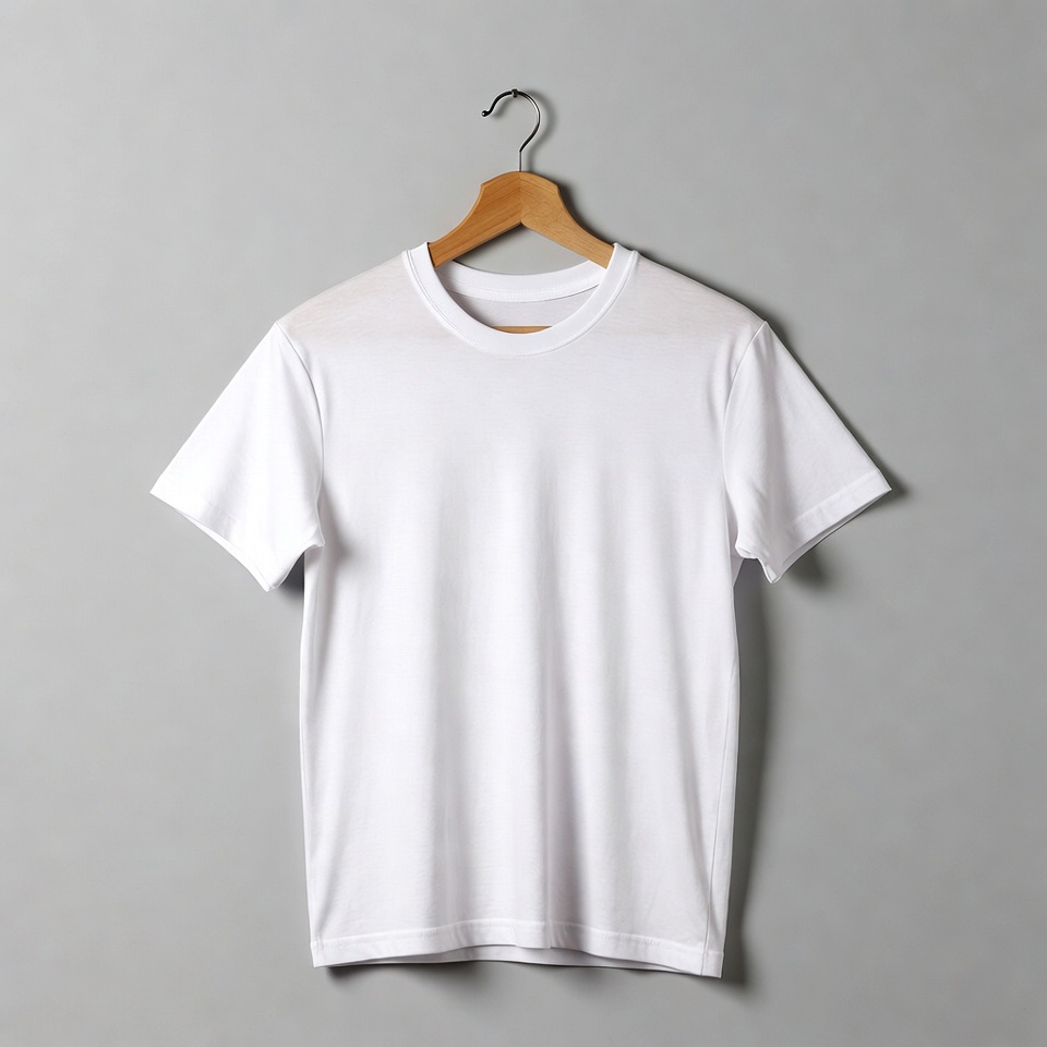 apparel, blank t-shirt, casual wear, clothing hanger, crew neck, empty t-shirt, fashion, isolated background, mockup, plain shirt, shirt, short sleeve, t-shirt, white shirt, wooden hanger, white t-shirt