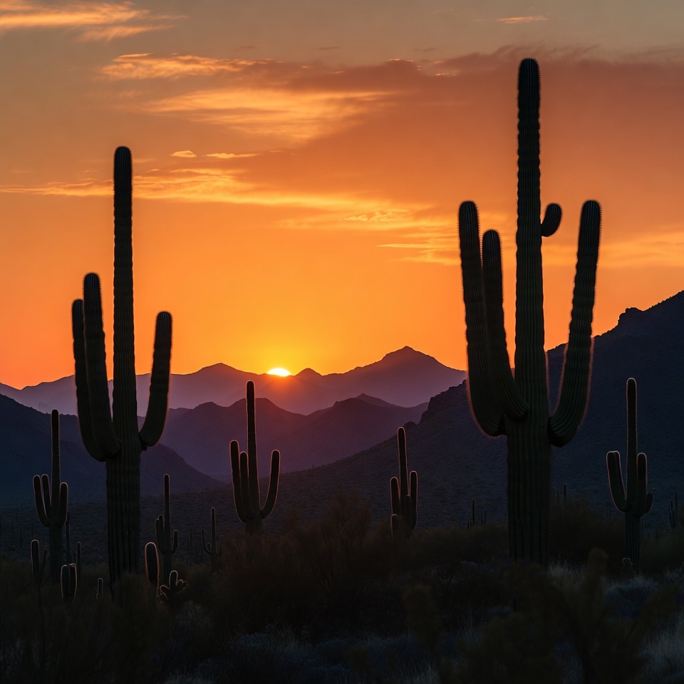 Arizona landscape, arid, cacti, desert, dusk, golden hour, horizon, landscape photography, mountains, nature, orange sky, outdoors, peaks, scenic, silhouette, sun, sunset, vegetation, wilderness, saguaro cactus