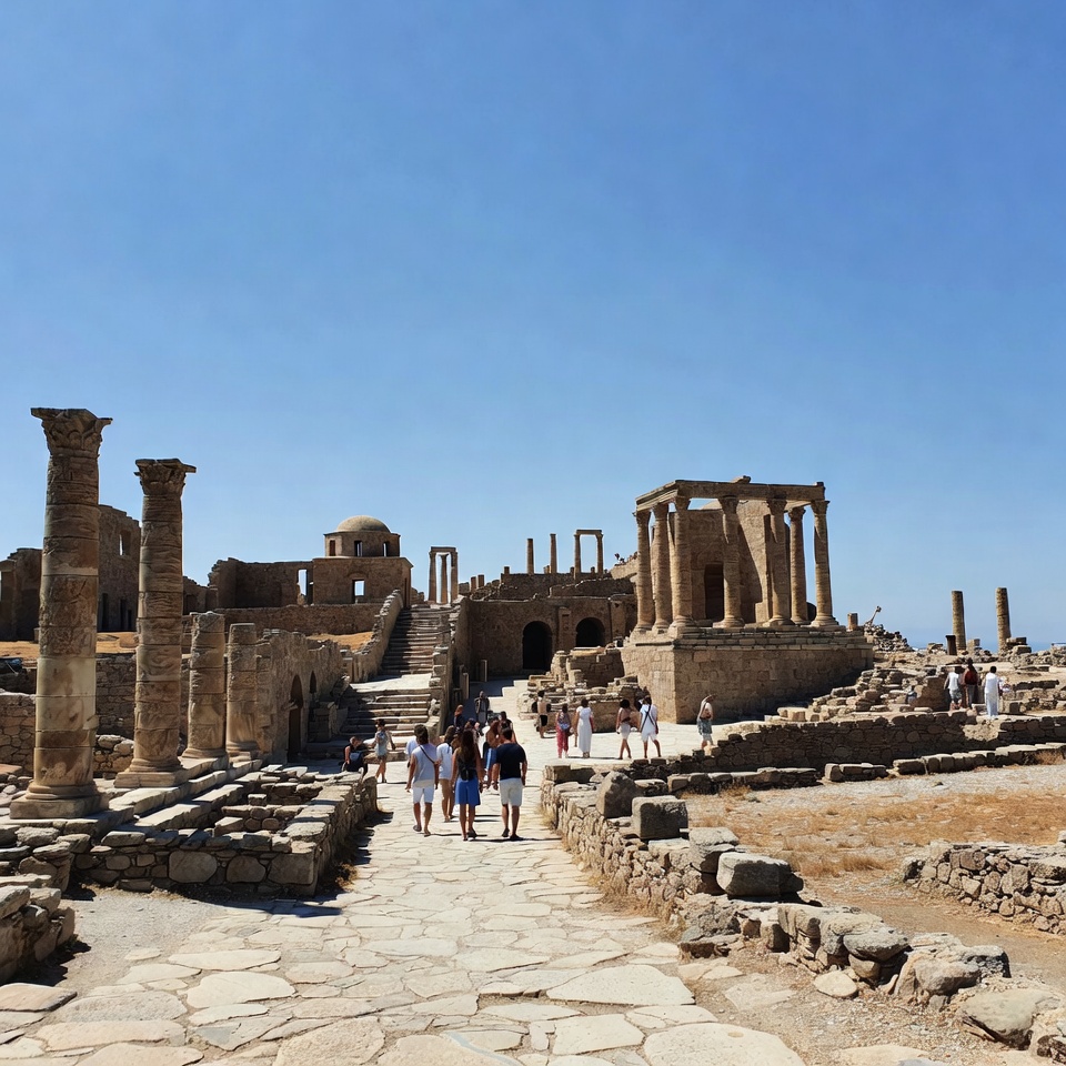 Tourists walk along a stone path through the ancient Roman ruins of Jerash under a clear blue sky. The site features tall stone columns, arched structures, and remnants of temples with people scattered among the weathered architecture. Visitors in casual summer clothes explore the historic site with mountains visible in the background.
