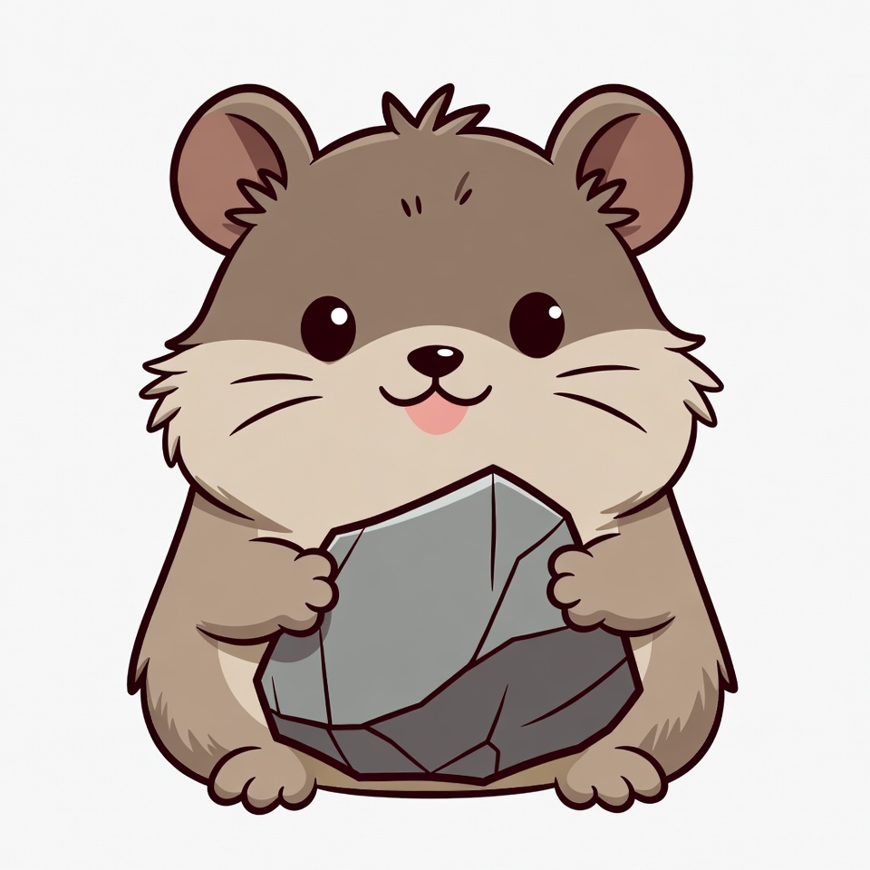 A kawaii cartoon hamster with big sparkling eyes and a smiling mouth holds a large gray rock with its tiny paws. The hamster has fluffy brown fur with cream-colored cheeks and stands on a plain white background. The illustration features soft lines and vibrant colors typical of chibi-style artwork.