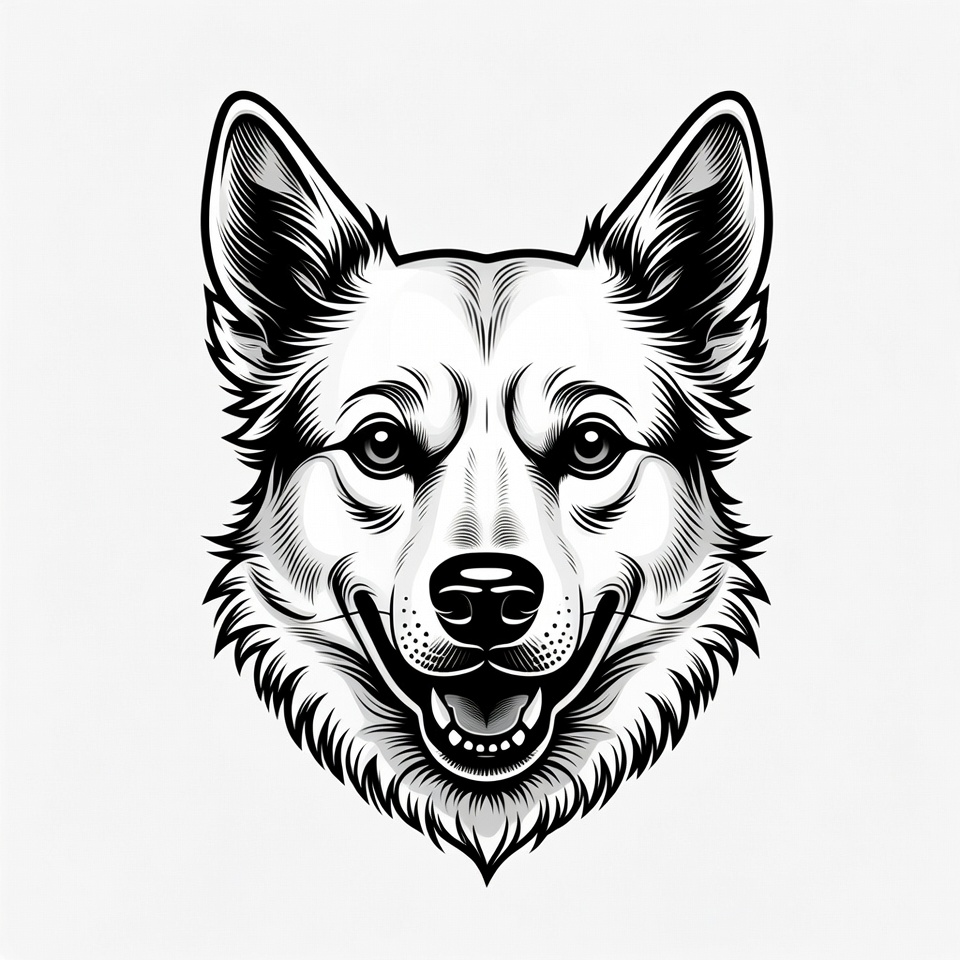 animal, black and white, black nose, canine, detailed drawing, dog face, dog head, dog portrait, fluffy dog, fur texture, green eyes, illustration, isolated background, line art, pet, pointed ears, smiling dog, white dog, dog