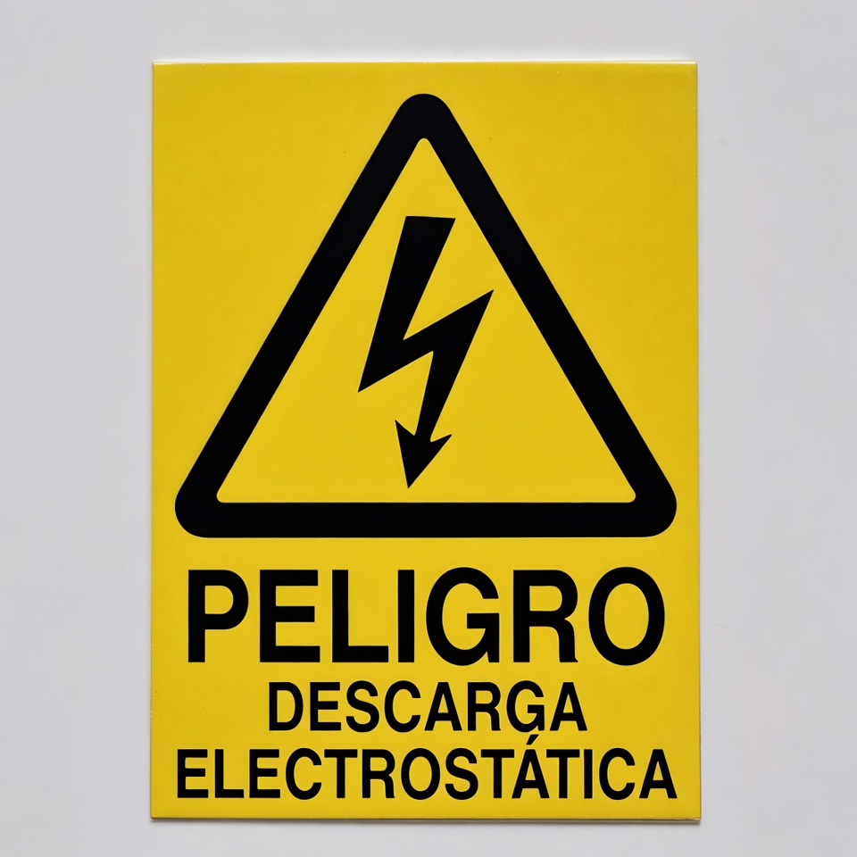 A yellow triangular warning sign with a black lightning bolt symbol pointing downward. Bold black text reads 'PELIGRO DESCARGA ELECTROSTÃTICA' warning of electrostatic discharge hazard. The sign is displayed against a plain white background.
