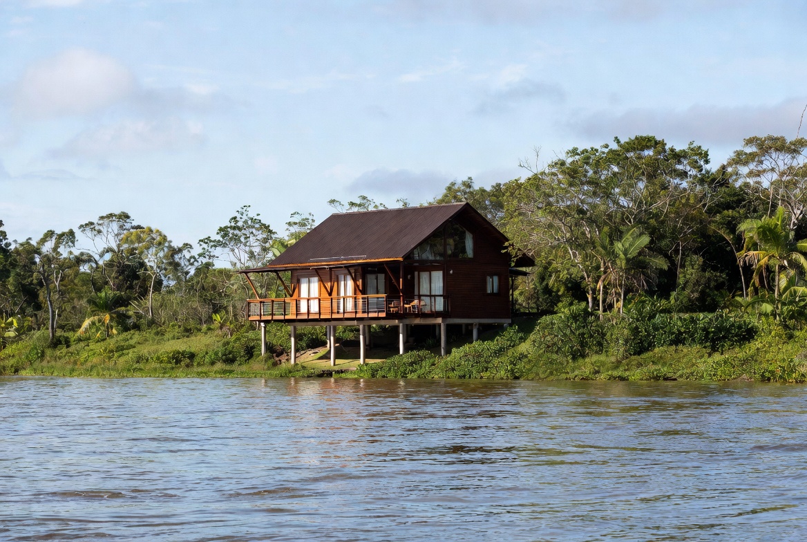 A wooden cabin with a sloped roof and balcony stands elevated on stilts along a calm river. It is surrounded by lush green trees and tropical vegetation under a partly cloudy sky. The cabin's reflection is visible in the clear water.