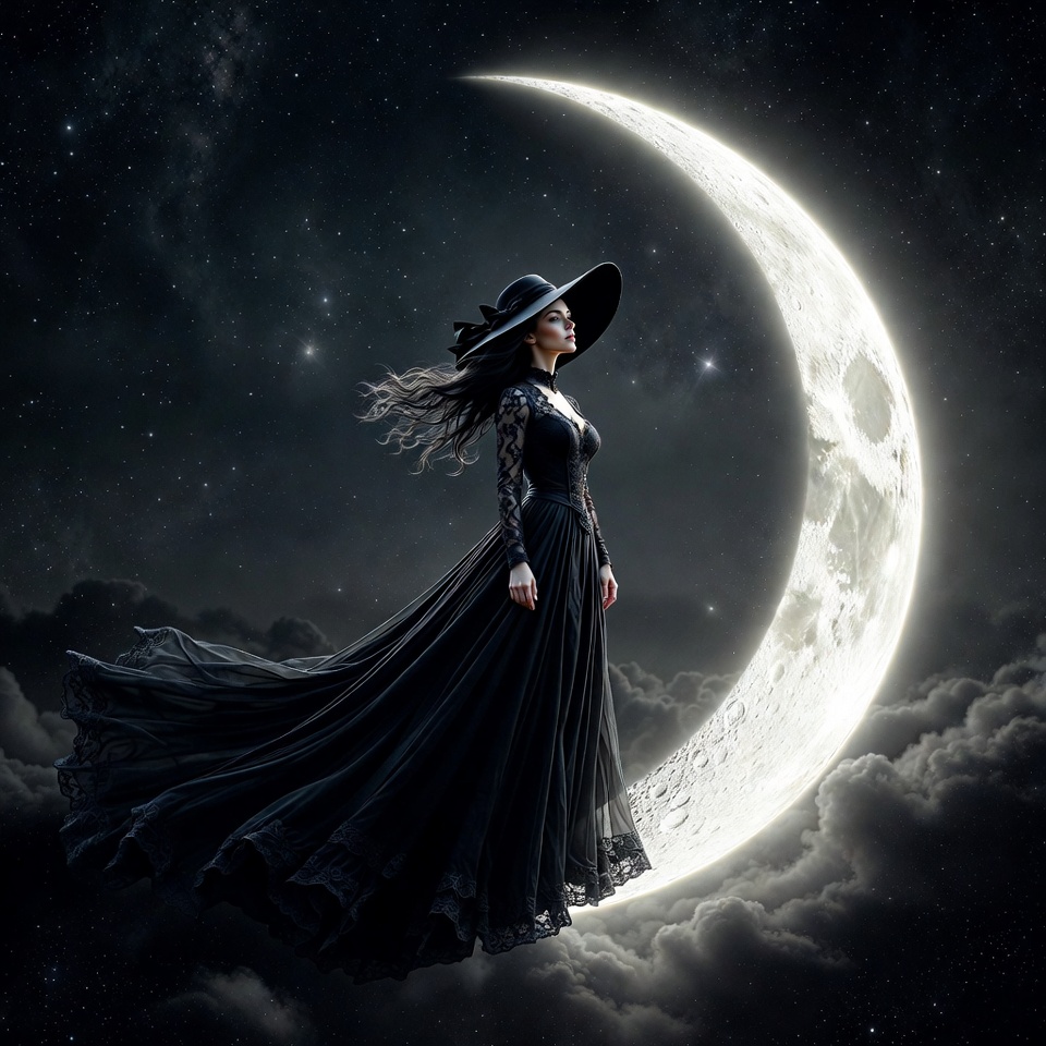 A woman dressed as a witch in a flowing black lace gown and wide-brimmed hat stands on a large glowing crescent moon. Her long dark hair flows in the wind as stars sparkle in the night sky behind her. Dark clouds frame the mystical scene.