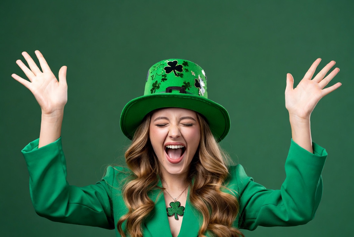 A young woman with long blonde hair wears a green leprechaun top hat decorated with shamrocks and a matching green blazer. She stands against a solid green background with her arms raised high and mouth open wide in excitement. A shamrock necklace hangs around her neck.