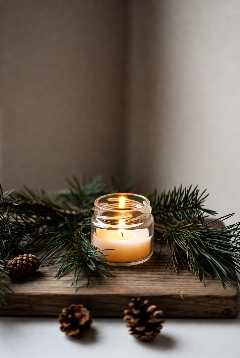 Christmas decor, evergreen, festive, fir branches, flame, glass jar, holiday candle, isolated background, lit candle, natural elements, pine branches, pinecones, rustic wood, soft glow, warm light, winter decor, wooden board, candle