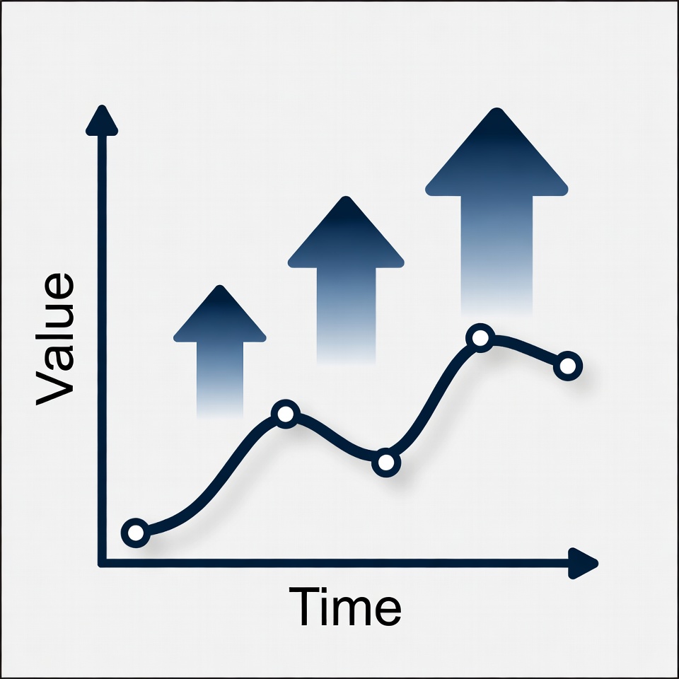 A line graph on a white background shows value increasing over time with a wavy blue line and connected dots. Three upward-pointing arrows of varying sizes and shades of blue emphasize the upward trend. The horizontal axis is labeled 'Time' and the vertical axis 'Value'.