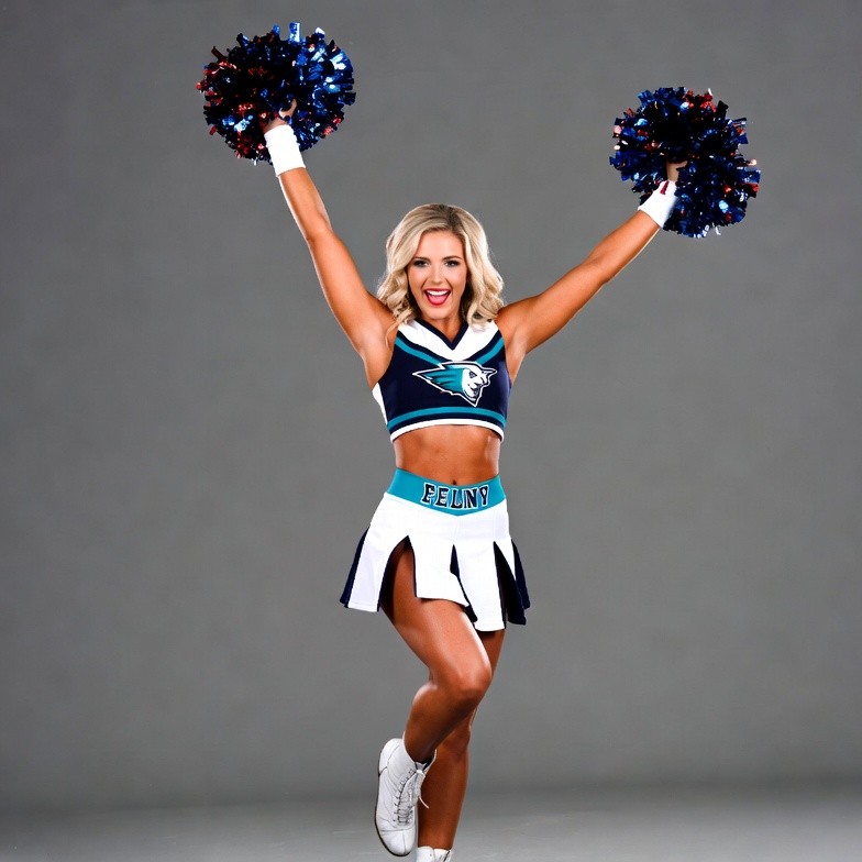 A blonde White woman in a navy and white cheerleader uniform holds blue and white pom poms with both arms raised high. She smiles energetically while standing on a gray background. Her outfit includes a cropped top, pleated skirt, and white sneakers.
