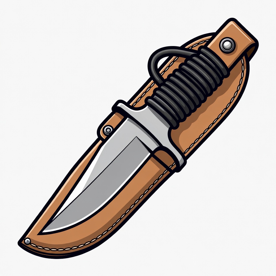 black handle, brown leather, clipart, combat knife, fixed blade, hunting knife, illustration, isolated background, knife sheath, leather sheath, military knife, outdoor gear, paracord, sheath knife, silver blade, tactical knife, weapon, survival knife