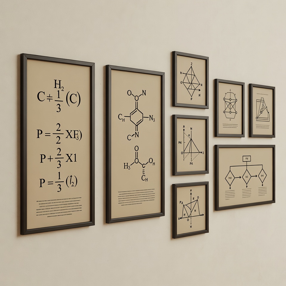 Multiple framed posters on a wall display chemistry formulas and molecular structures. One shows chemical equations for H2, C, P, and F compounds. Others feature organic molecules, geometric diagrams, and chemical diagrams in beige frames against a light background.