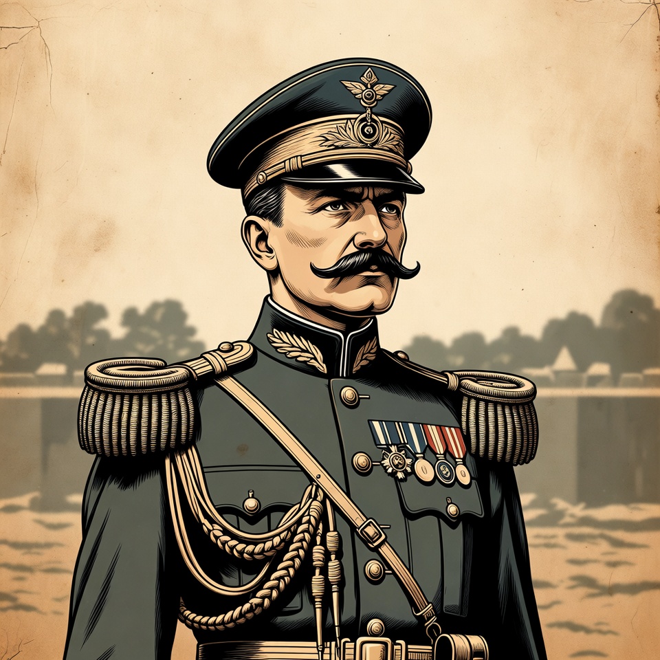 An illustration of a stern military officer with a thick mustache wears a dark green uniform adorned with gold epaulets, medals, and a peaked cap featuring an emblem. He stands confidently in a three-quarter view against a faded beige background with subtle outlines of trees and a bridge. The artwork has a vintage, aged paper texture with detailed line art shading.