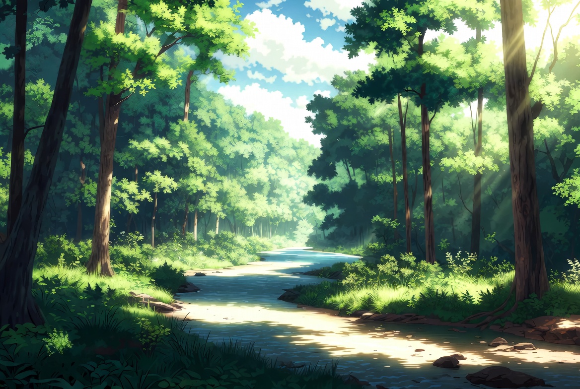 anime art, clipart, foliage, forest path, grass, green trees, illustration, isolated background, lush forest, natural light, nature, path, river, rocks, serene landscape, stream, sunbeams, sunlight, sunlight rays, tall trees, trees, vibrant green, winding stream, woods, forest