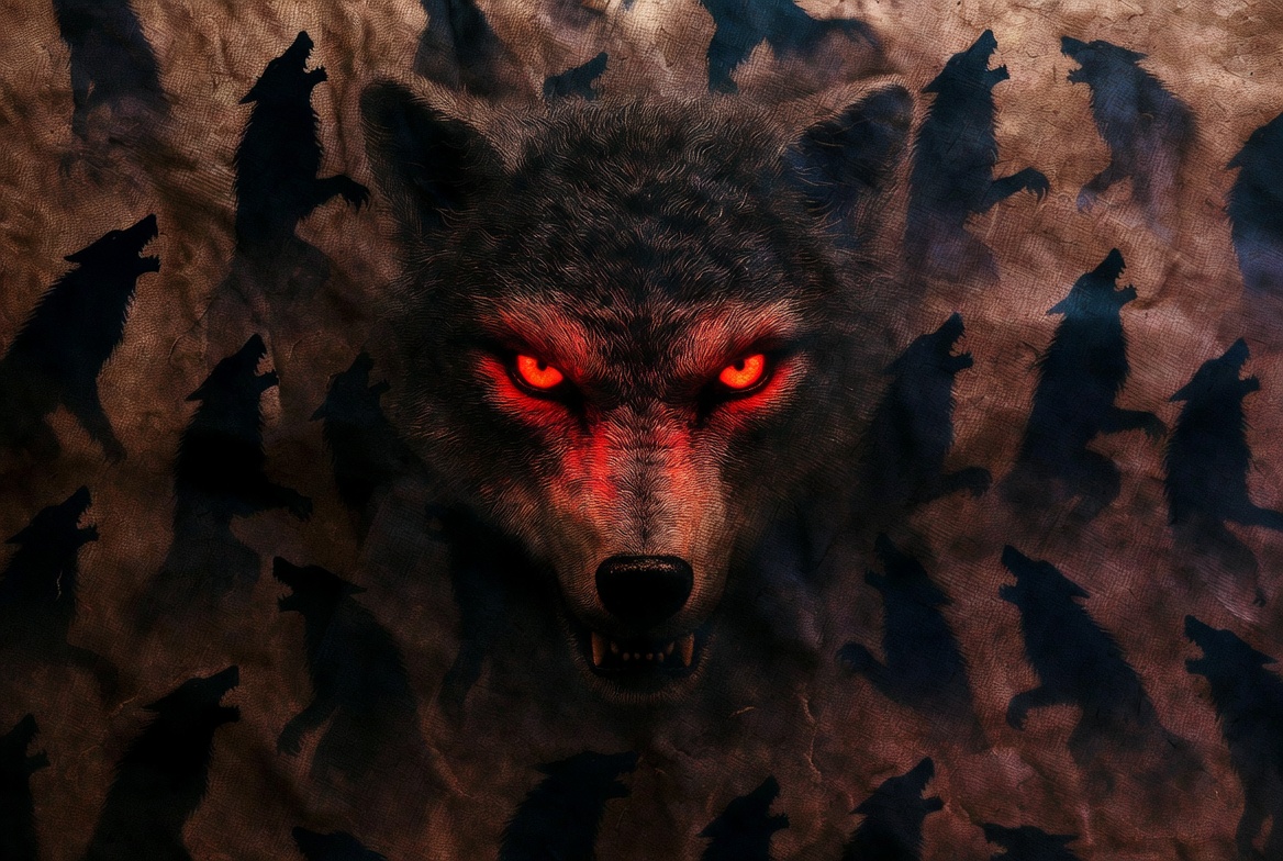 A detailed illustration features a snarling gray wolf with glowing red eyes in the foreground. The wolf's face is prominent against a dark textured background filled with numerous shadowy silhouettes of wolf heads. The overall composition creates a menacing pack atmosphere.