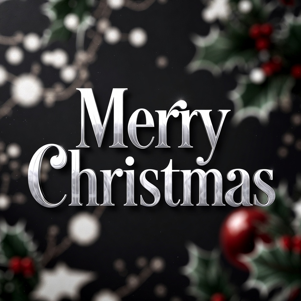 Shiny silver 'Merry Christmas' text stands out against a dark bokeh background. Holly leaves, red berries, and Christmas ornaments surround the text. White sparkles and lights add a festive glow.
