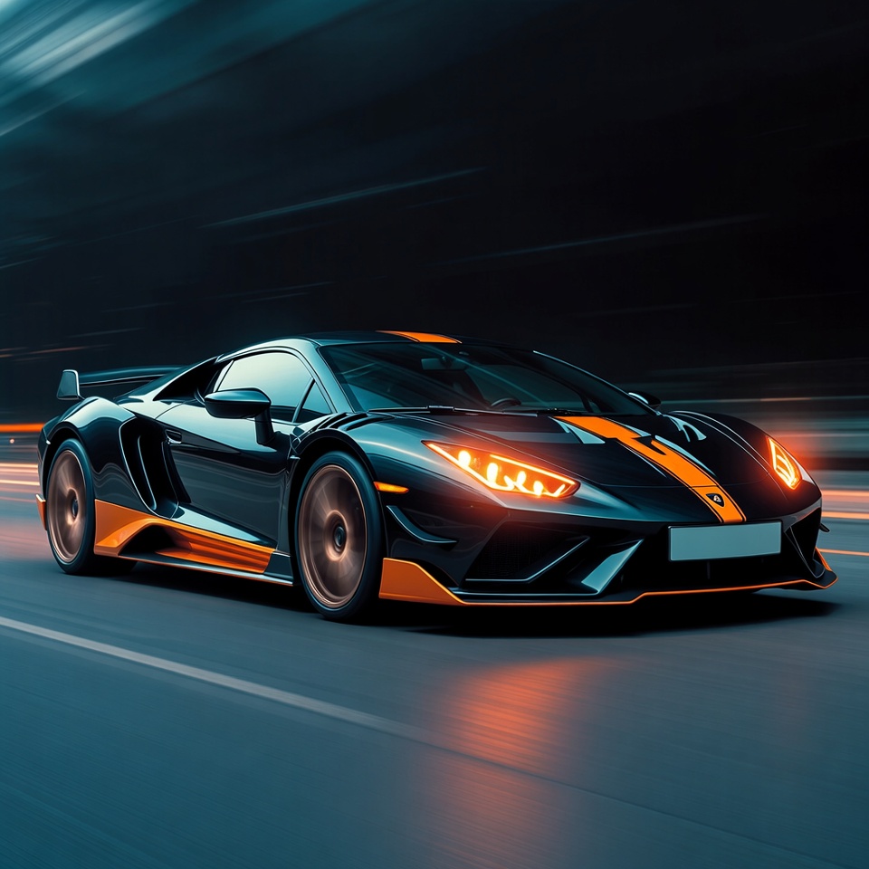 A sleek black Lamborghini Huracan supercar with orange accents races down a dark road at night. Bright orange headlights illuminate the blurred surroundings, creating a dynamic motion blur effect. The car features aerodynamic design, large wheels, and glowing taillights.