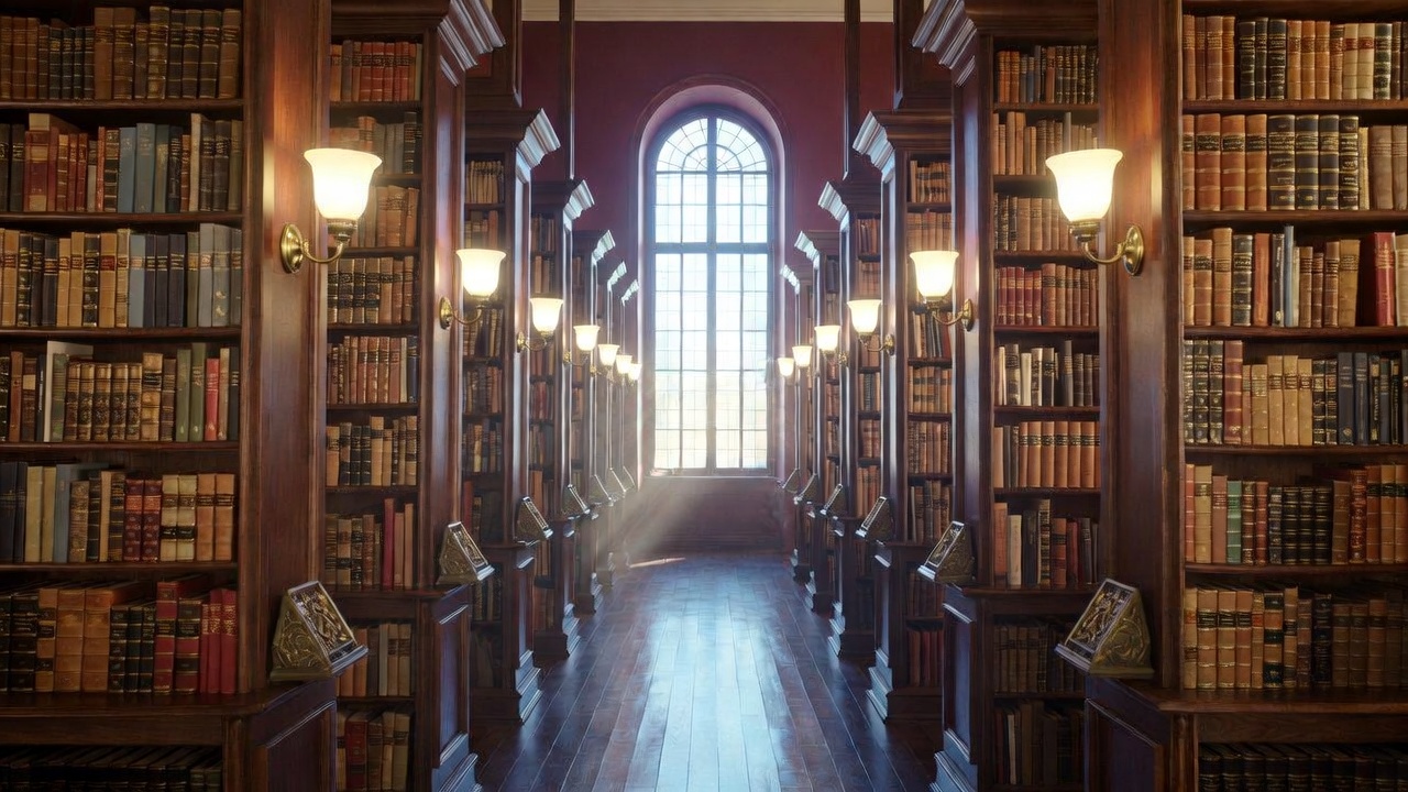 Grand library aisle with sunlight