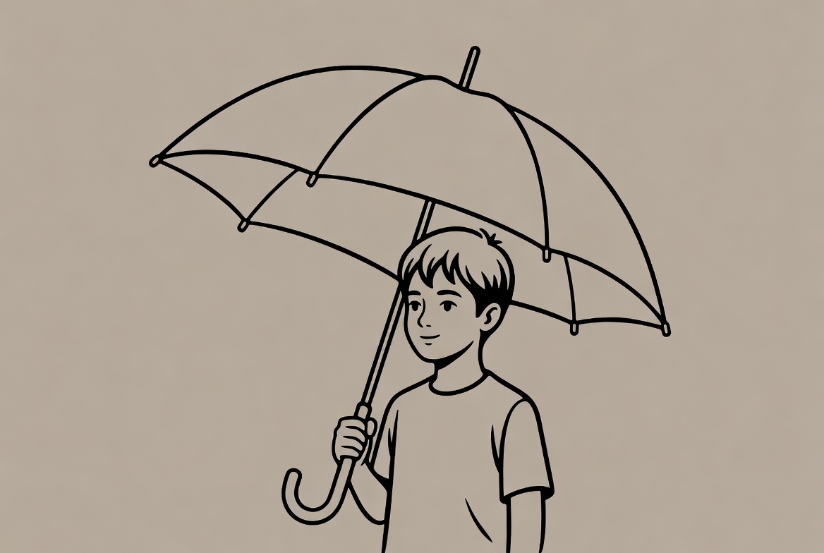 A line art illustration depicts a young boy standing and holding a large open umbrella with both hands. He wears a short-sleeved t-shirt and has short hair, smiling slightly. The image is on a solid beige background.