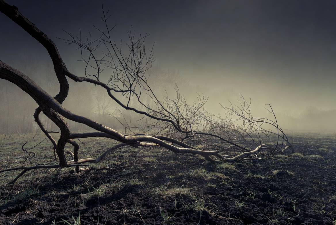atmospheric, bare tree, barren, branches, burnt ground, dark landscape, decay, eerie atmosphere, fallen tree, fog, foggy field, grass, mist, monochrome, moody landscape, natural, nature, outdoors, overcast sky, scenery, silhouette, twisted branches, wilderness, dead tree