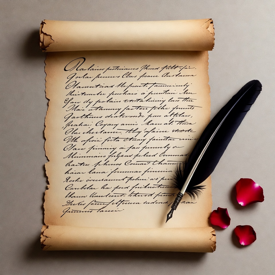 A rolled ancient parchment scroll with elegant cursive writing in black ink lies on a light background. A black feather quill rests beside it, accompanied by scattered red rose petals. The scroll features ornate script resembling historical or love letter text.