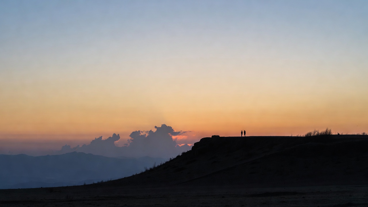 backlit, cliff, clouds, couple, dusk, edge, female, golden hour, grass, hilltop, horizon, landscape, male, mountains, nature, orange sky, outdoors, peaceful view, people, pink sky, scenic, sky, standing, sunset, silhouette