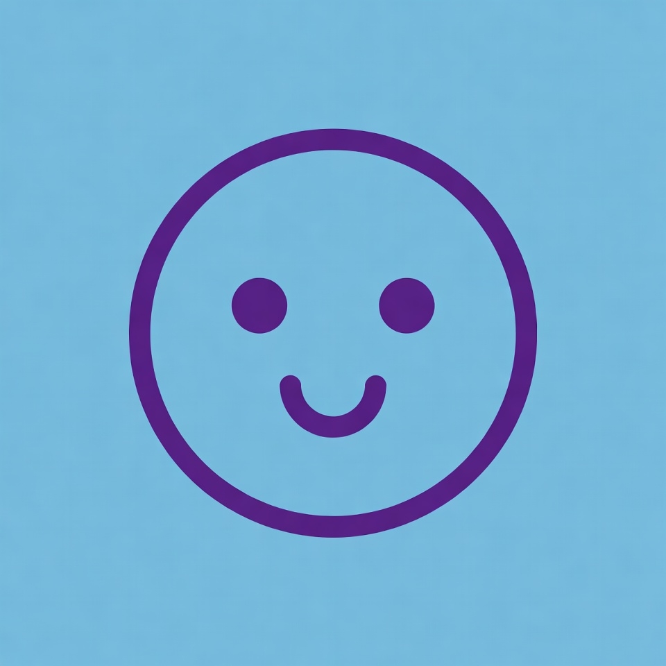 cartoon face, clipart, curved smile, emoji, fun icon, graphic, happy face, icon, illustration, isolated background, light blue background, outline, purple smiley, round eyes, simple face, smiley, vector, smiley face