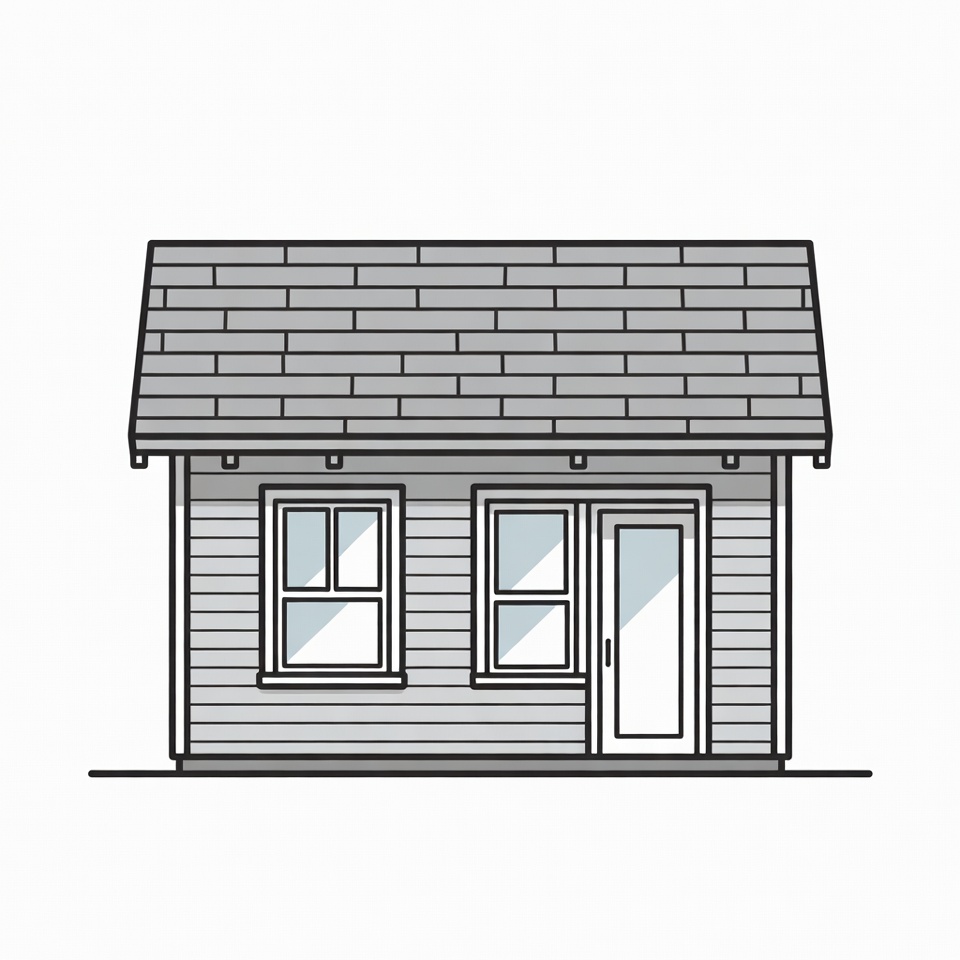 A minimalist line drawing of a small house with a sloped shingled roof. It features two rectangular windows with cross panes and a central door, all outlined in gray on a white background. The house has wooden siding and stands isolated.