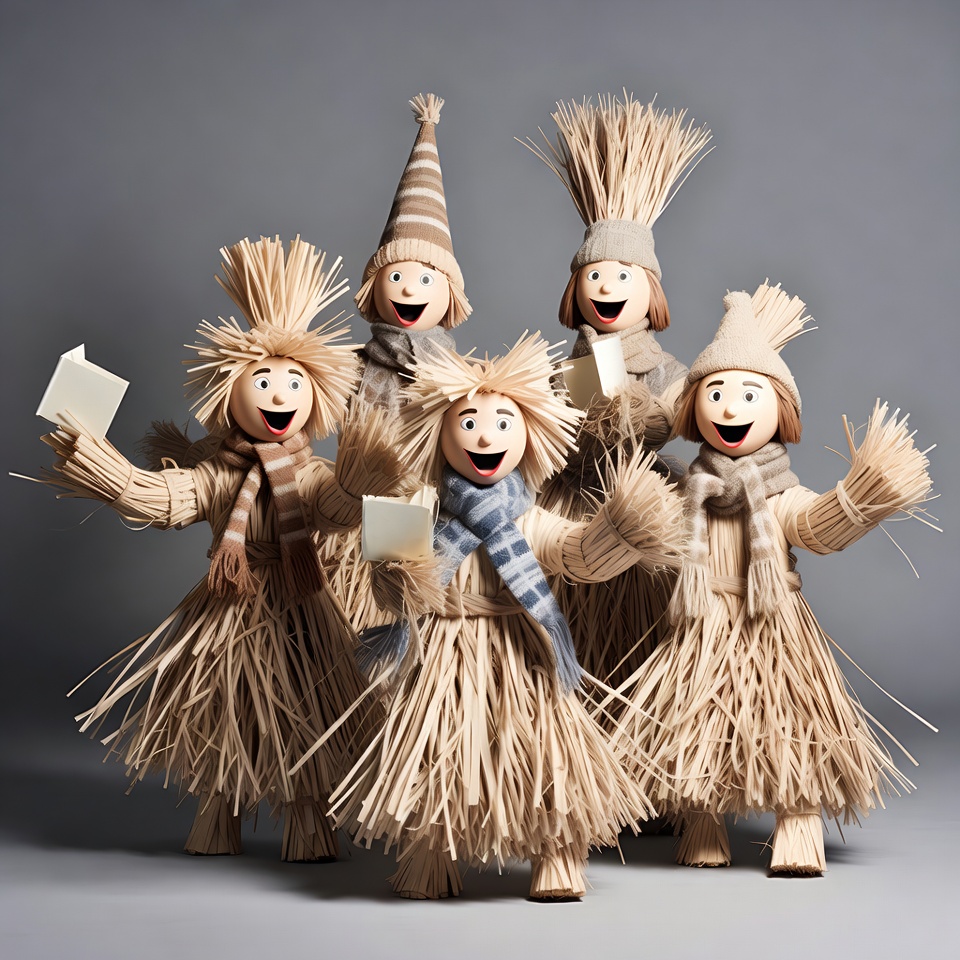 beanie hat, cartoon dolls, choir dolls, colorful scarves, cone hats, craft dolls, doll group, female dolls, festive dolls, girls, group dolls, handmade dolls, illustration, isolated background, joyful expressions, music sheets, performance dolls, puppets, sheet music, singing dolls, straw skirts, striped hat, toy dolls, winter scarves, straw dolls
