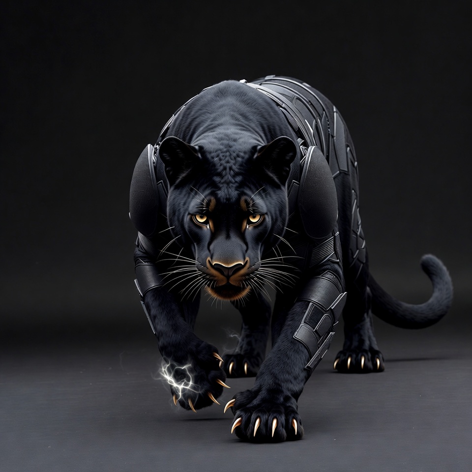A black panther with cyberpunk armor prowls forward on a dark background. It features metallic shoulder pads, leg guards, and glowing yellow eyes. Sharp claws extend from its paws as it moves aggressively.