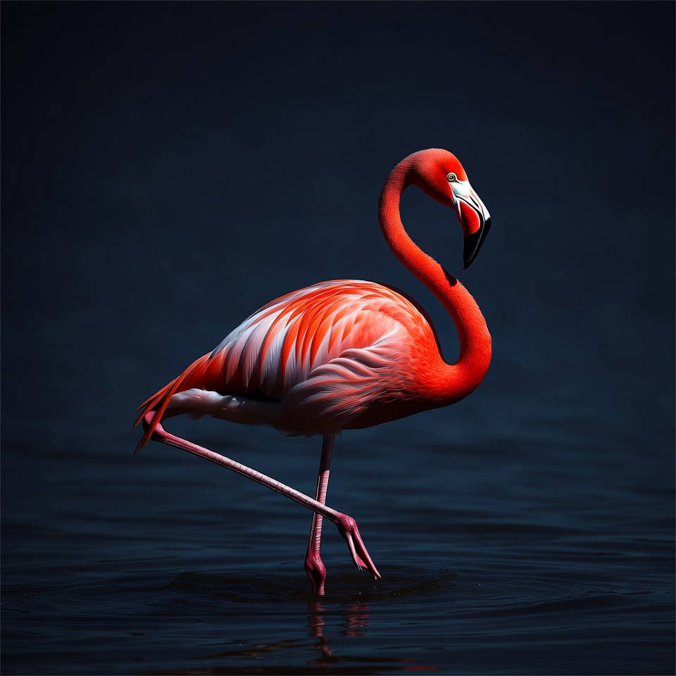 A vibrant pink flamingo stands gracefully in shallow dark water. Its long neck is curved elegantly with a black-tipped beak and bright green eyes. The bird's feathers show intricate pink and white patterns against the deep blue background.