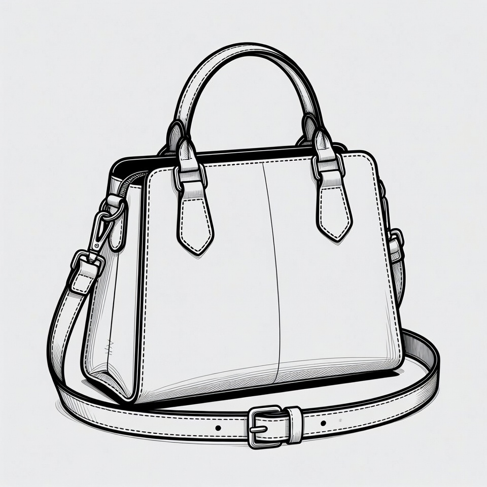 A detailed line art illustration of a stylish handbag viewed from the side. The handbag features dual top handles, a long adjustable shoulder strap with buckle, and textured leather details. It has a structured rectangular shape with flap accents and stitching.
