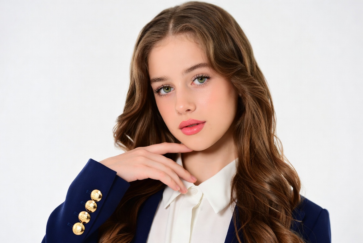 A young woman with long wavy brown hair poses thoughtfully against a white background. She wears a navy blue blazer with gold buttons over a white collared shirt. Her hand touches her chin, and she has pink lipstick and green eyes.