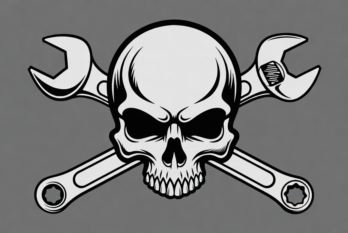 black and white, clipart, crossed wrenches, death symbol, edgy art, graphic design, illustration, industrial design, isolated background, line art, mechanic skull, monochrome, pirate skull, skull and wrenches, tattoo design, tools, vector art, wrench skull, wrenches, skull