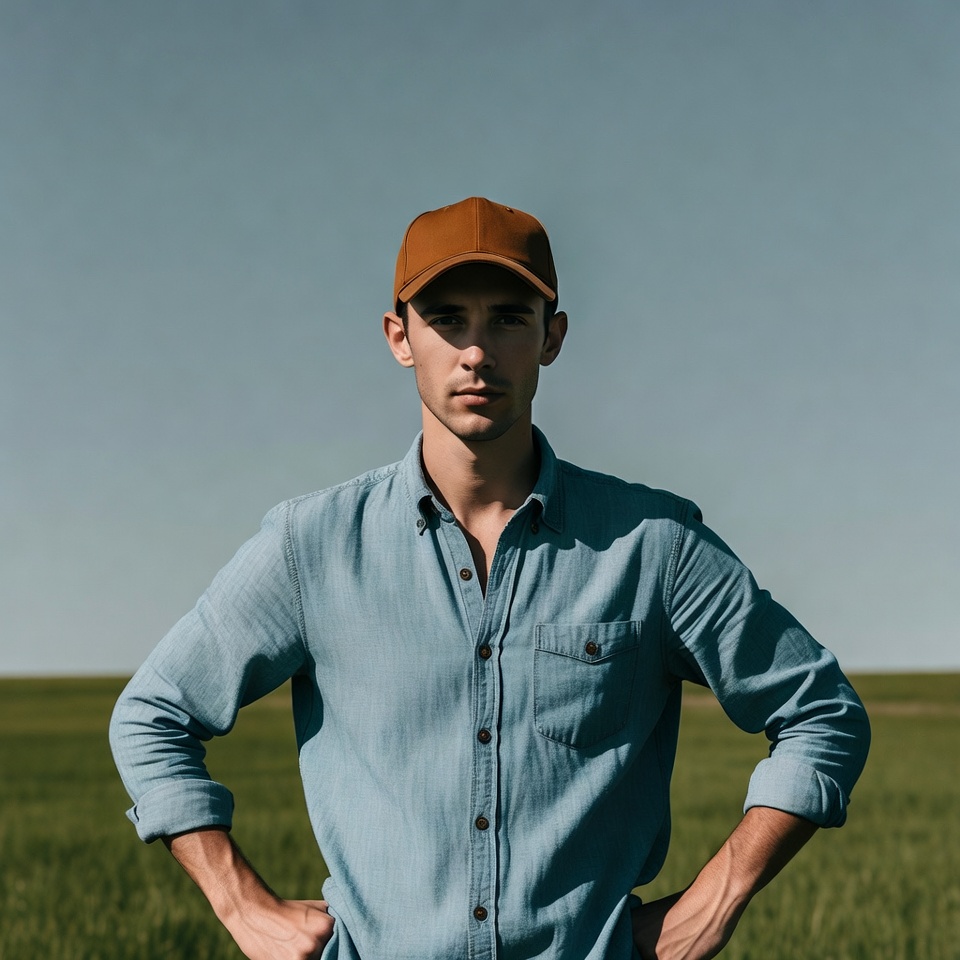 White, agriculture, baseball cap, blue shirt, brown cap, button-up shirt, casual clothing, clear sky, confident pose, farmer style, green field, hands on hips, male, neutral expression, outdoors, portrait, short hair, standing, young man, man