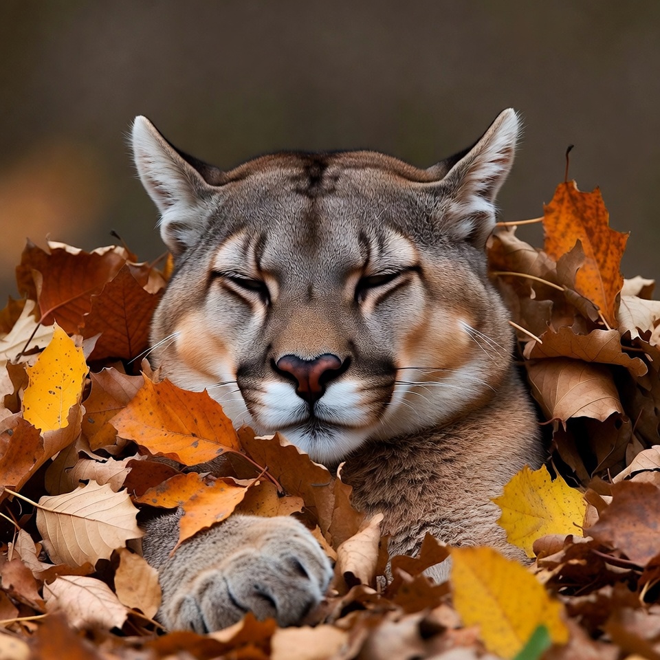 autumn leaves, cat, closed eyes, fall foliage, isolated background, mountain lion, nature, orange leaves, paws, puma, resting, wild animal, wildlife, yellow leaves, cougar
