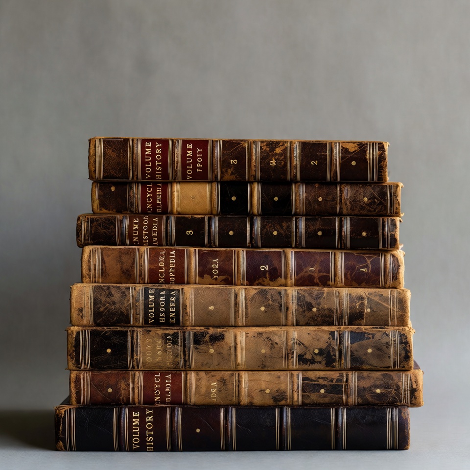 A tall stack of vintage leather-bound books sits on a plain gray background. The books feature worn spines with gold lettering, including titles like 'History' and volume numbers. They display aged brown and black covers with decorative embossing.