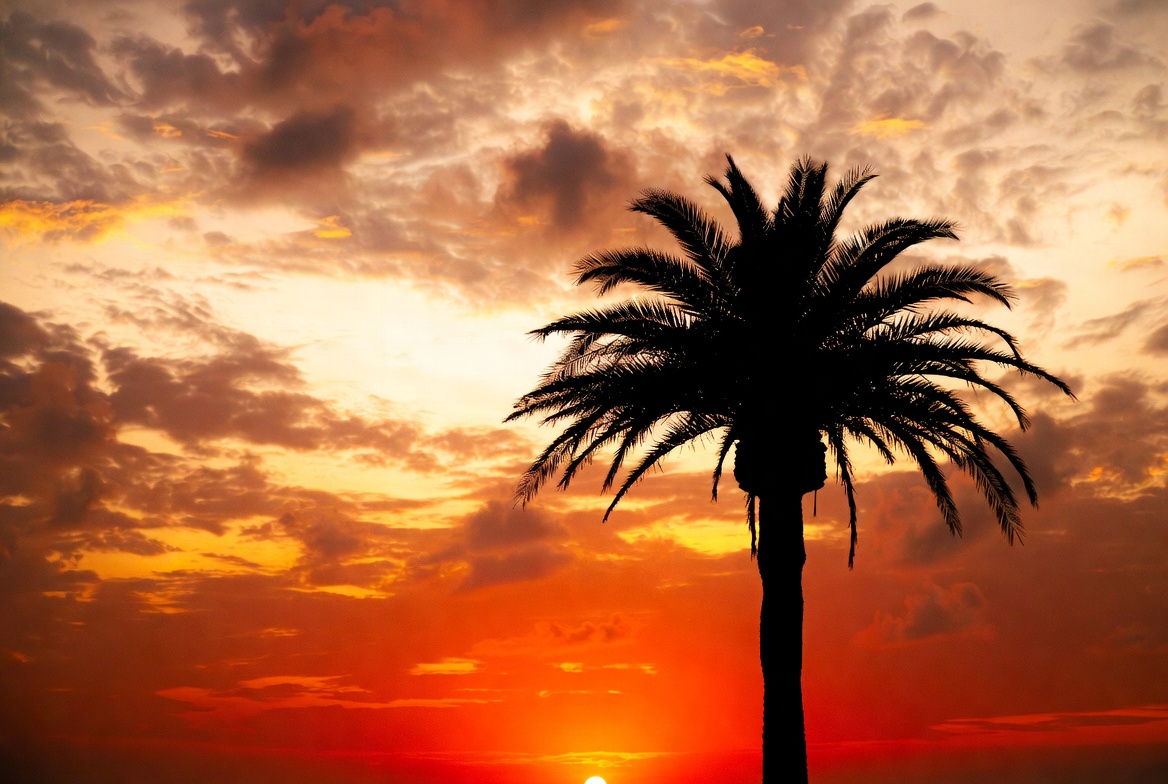 A tall palm tree stands in dark silhouette against a vibrant orange and red sunset sky. The sun is low on the horizon, casting a warm glow through scattered clouds. The image features a striking contrast between the black palm fronds and the colorful sky.