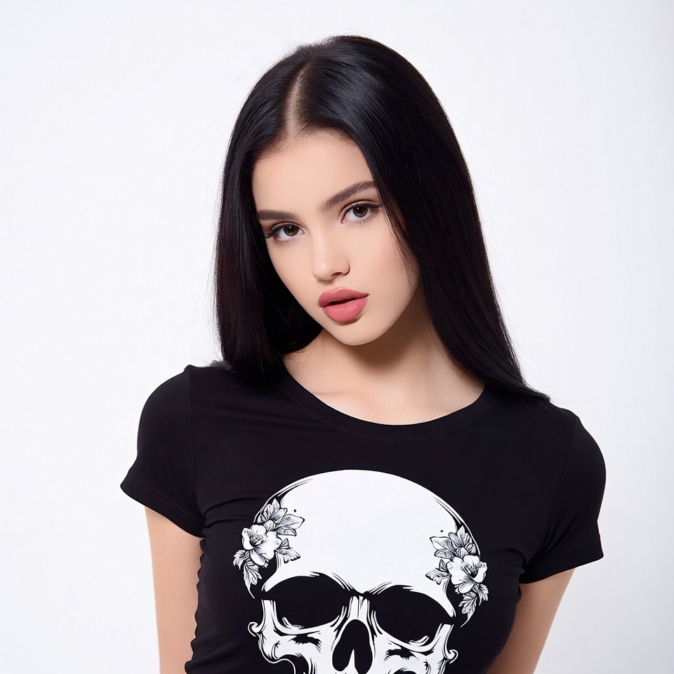 A young woman with long straight black hair tilts her head slightly while wearing a black t-shirt featuring a large white skull with flowers. She has subtle makeup with pink lips and stands against a plain white background. Her expression is soft and alluring.