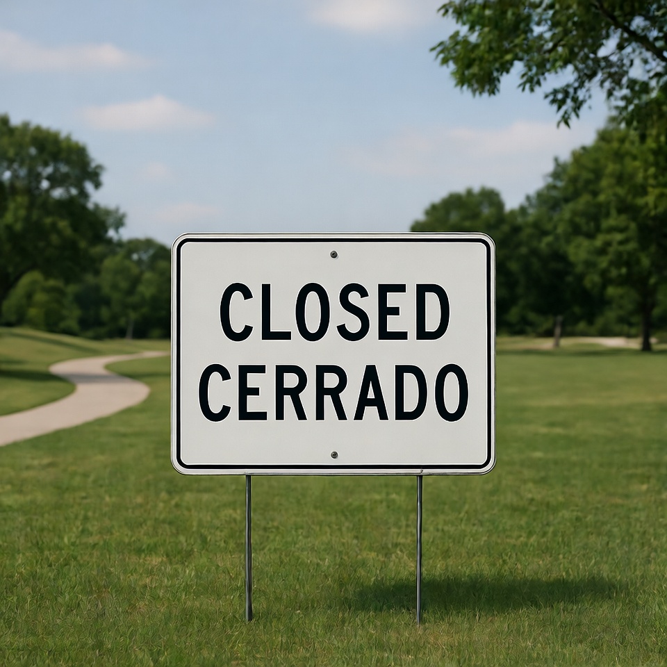 bilingual sign, blue sky, cerrado sign, clouds, golf course, green grass, isolated sign, metal poles, nature background, outdoor sign, park, signpost, trees, walking path, white sign, closed sign