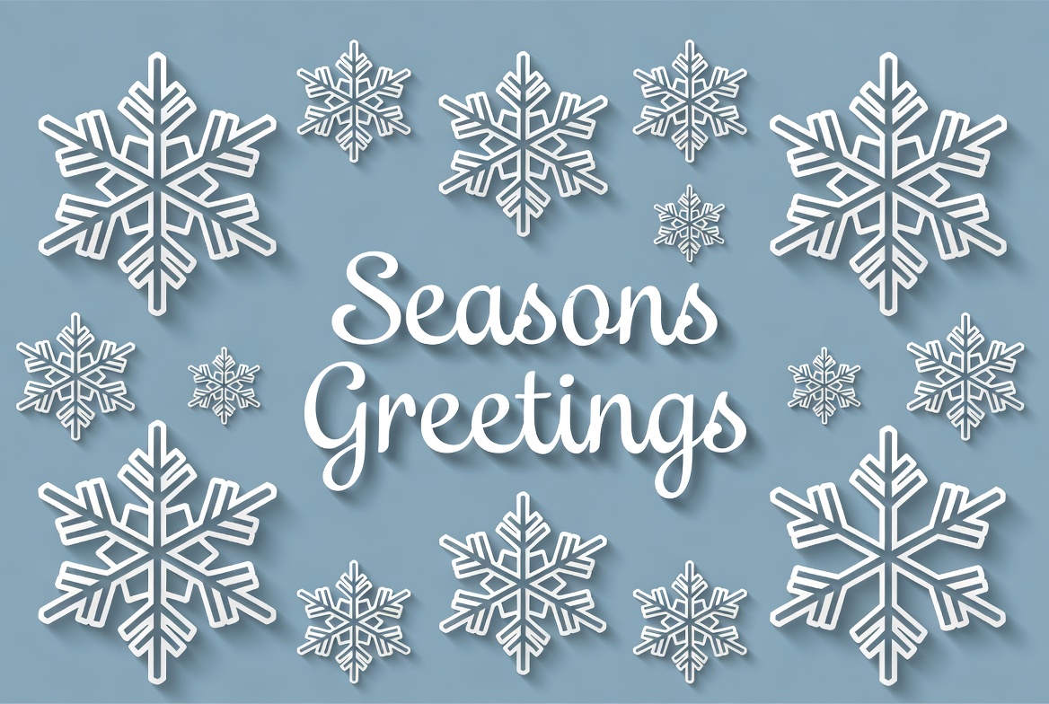 A digital illustration features white paper-cut snowflakes arranged around the text 'Seasons Greetings' on a light blue background. The snowflakes vary in size and are positioned symmetrically. The design has a clean, festive holiday appearance.