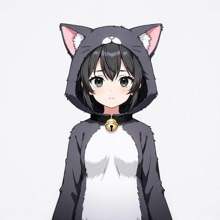 Asian, anime character, bell collar, big eyes, black hair, cartoon girl, cat costume, cat ears, cat hoodie, choker, cute girl, ears, female, fluffy fur, gray hoodie, hood, illustration, isolated background, kawaii, manga style, neko cosplay, white fur, anime girl
