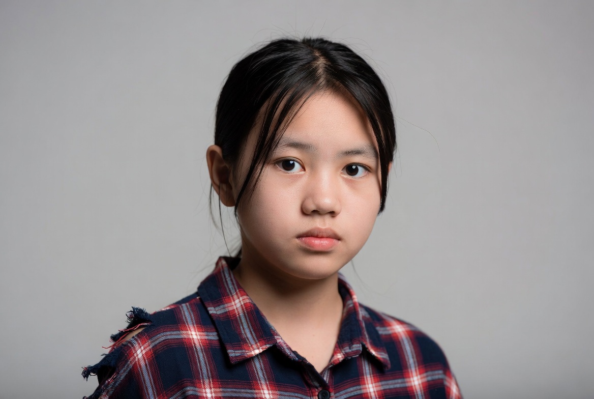 A young Asian girl with straight black hair tied back stands against a plain gray background. She wears a dark red and black plaid shirt with frayed edges and has a neutral expression. Her face is front-facing with prominent eyes and subtle bangs.