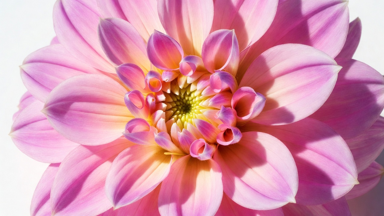 A vibrant pink dahlia flower is captured in close-up view against a white background. The petals display shades of pink with curled edges surrounding a bright yellow center. Sunlight highlights the flower's detailed texture and vivid colors.