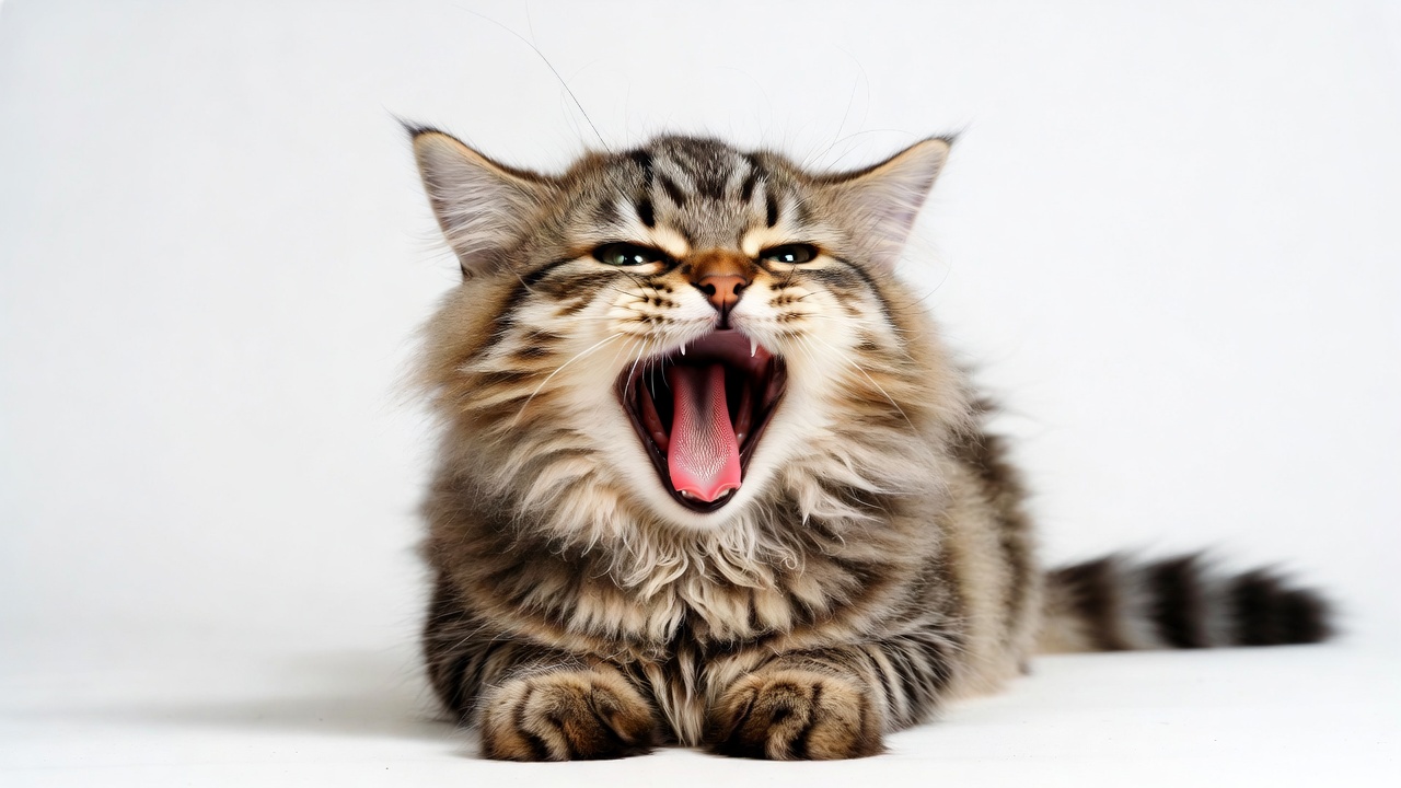 A fluffy tabby kitten with striped gray fur lies on a white background, yawning with its mouth wide open. Its sharp teeth and pink tongue are visible inside the open mouth. The kitten's green eyes are narrowed, and its front paws are extended forward.