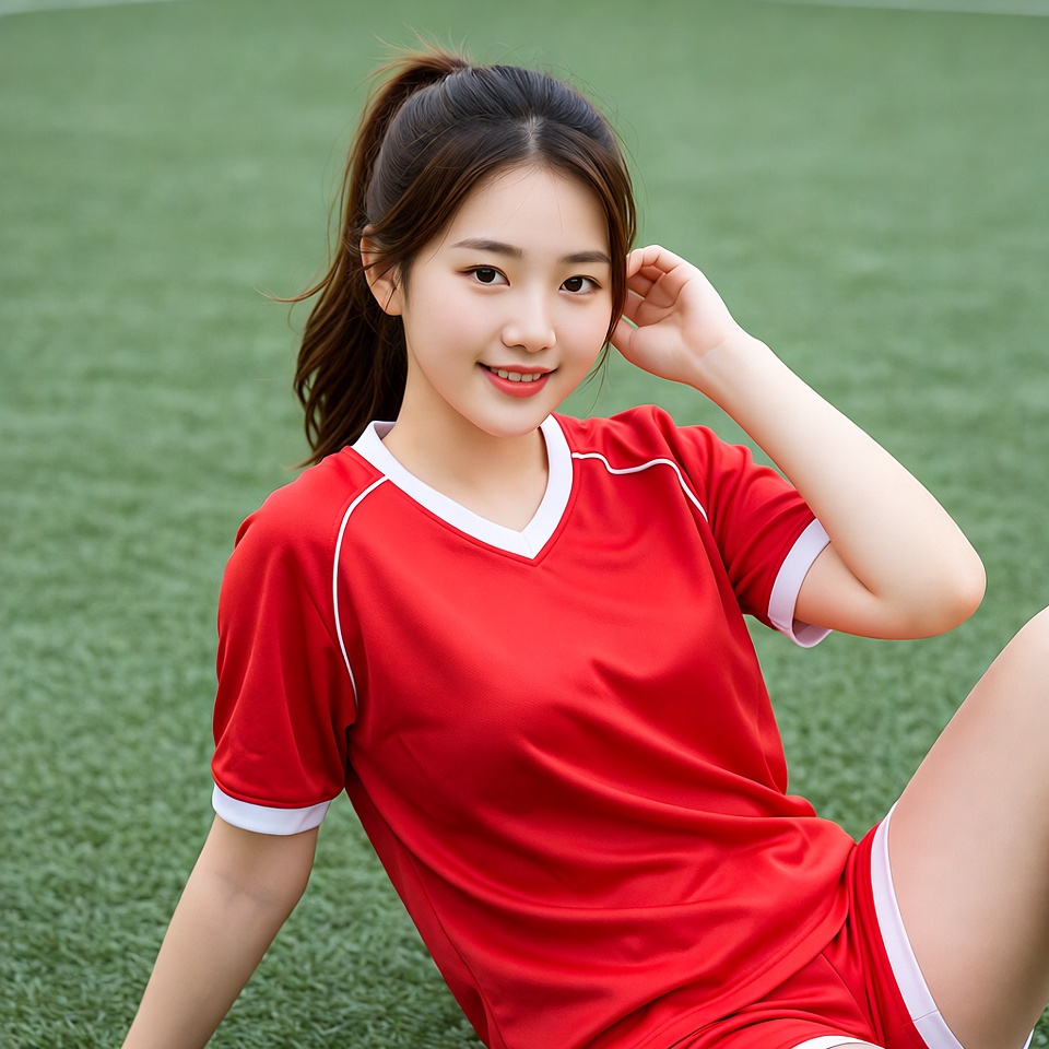 A young Asian woman with long dark hair in a ponytail wears a red and white V-neck soccer jersey and matching shorts. She sits on a green artificial turf field, smiling at the camera while touching her hair with one hand. Her legs are extended forward in a relaxed pose.