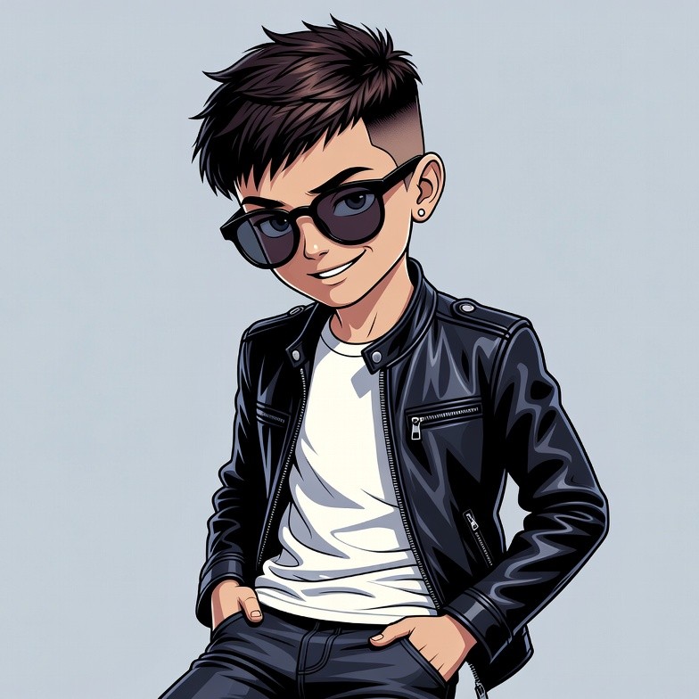 Asian, boy, cartoon boy, chibi boy, cool boy, dark hair, dark pants, hands in pockets, illustration, isolated background, leather jacket, male, smiling, stylish boy, sunglasses, undercut hairstyle, white t-shirt, young boy, anime boy