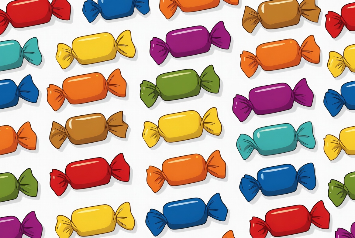 A vibrant illustration features numerous wrapped candies in various bright colors arranged in a repeating pattern. Each candy has shiny foil wrappers in shades of red, blue, yellow, green, purple, orange, teal, and brown. The candies are depicted on a white isolated background.
