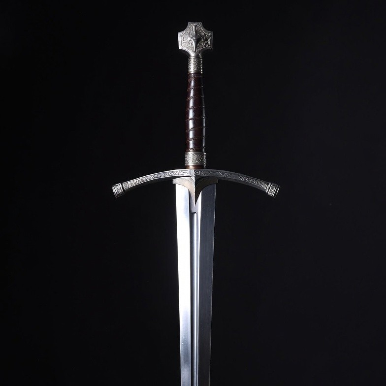 A detailed medieval longsword with a silver crossguard featuring intricate engravings stands vertically against a solid black background. The blade is straight and polished silver, while the grip is wrapped in dark leather. The ornate pommel and quillons add to its historical knightly design.