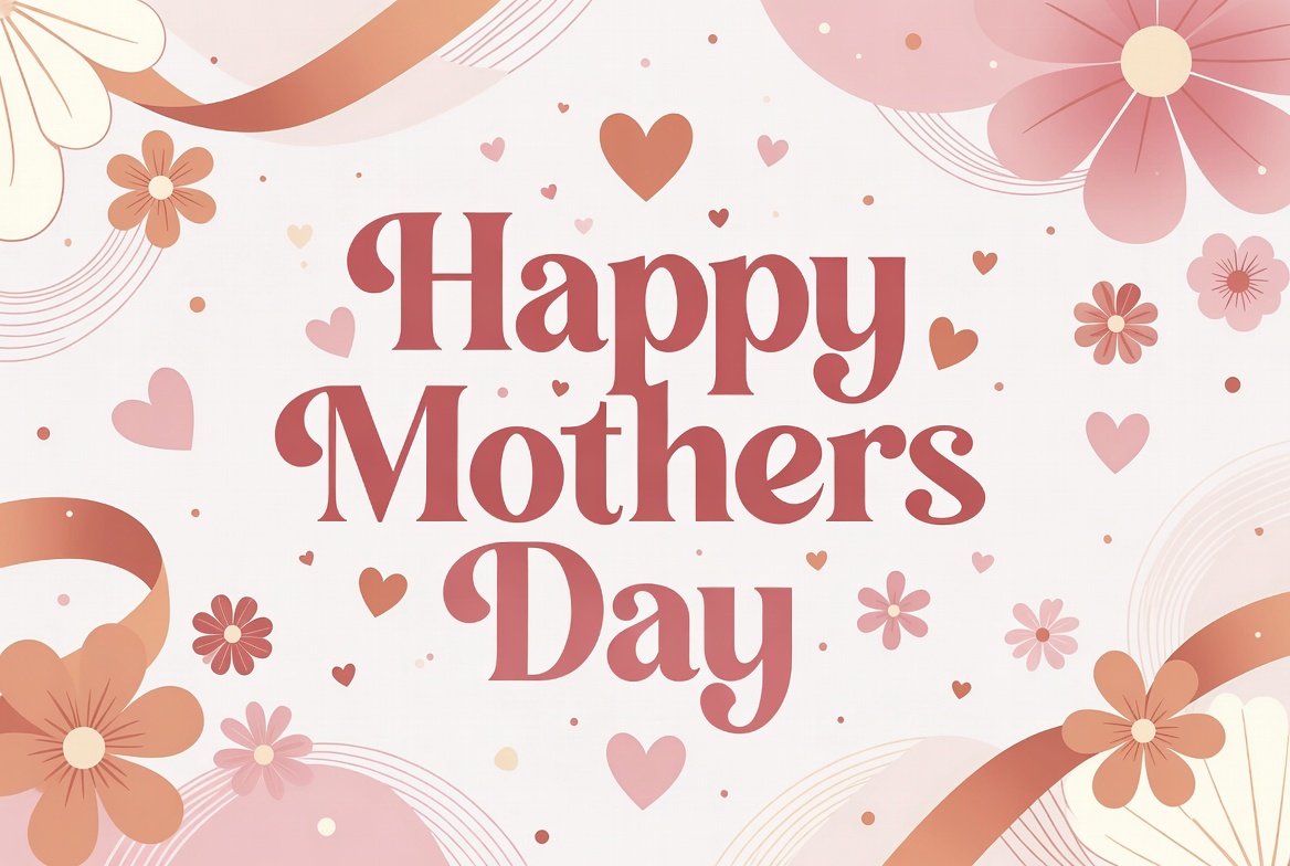 beige background, clipart, cursive text, digital illustration, festive greeting, floral design, greeting card, happy mothers day, hearts, holiday card, illustration, isolated background, mothers day card, orange ribbons, pink background, pink flowers, ribbons, vector art, wavy lines, white flowers, mothers day