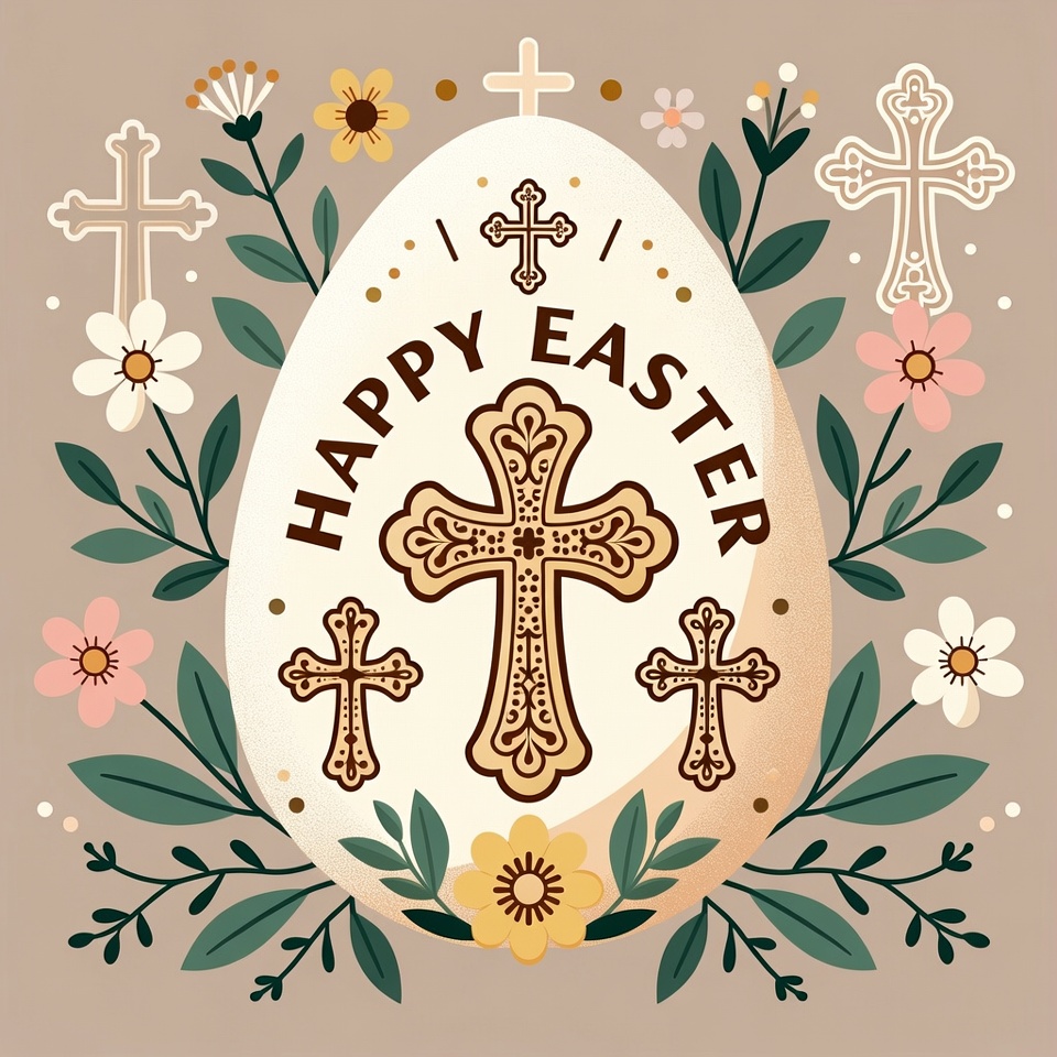 An illustration features a large white Easter egg decorated with ornate beige crosses in the center. Surrounding the egg are colorful flowers, green leaves, and additional white crosses. The text 'Happy Easter' is prominently displayed across the egg.