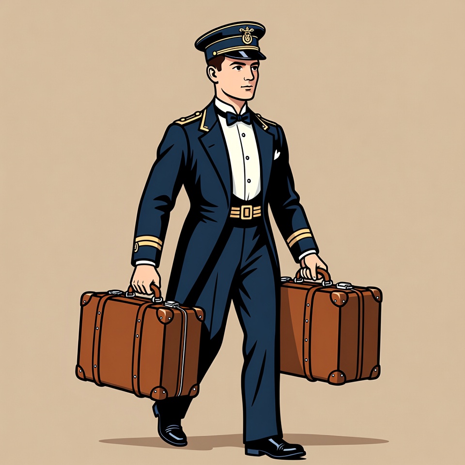 White, bow tie, brown suitcases, carrying bags, clipart, epaulets, formal wear, gold buttons, illustration, isolated background, luggage, male, naval officer, navy blue uniform, peaked cap, porter, standing, suitcases, tails coat, travel, uniform, vector art, vintage style, man